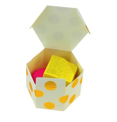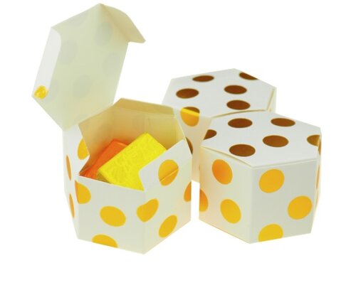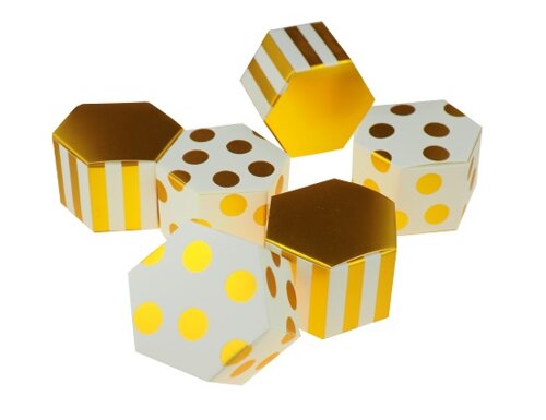 2 pralinky (℮ 20g netto) obalené vo fólii v bielej krabičke so zlatými bodkami. Veľkosť krabičky 5 x 3,5cm.