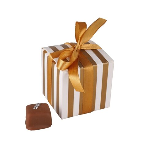 8 mix praliniek (℮ 85g netto) balené do darčekovej krabičky so zlatými pásikmi a zaviazanej ozdobnou stuhou. Veľkosť krabičky: 5,5 x 5,5 x 5,5cm. Stuha zlatá.
