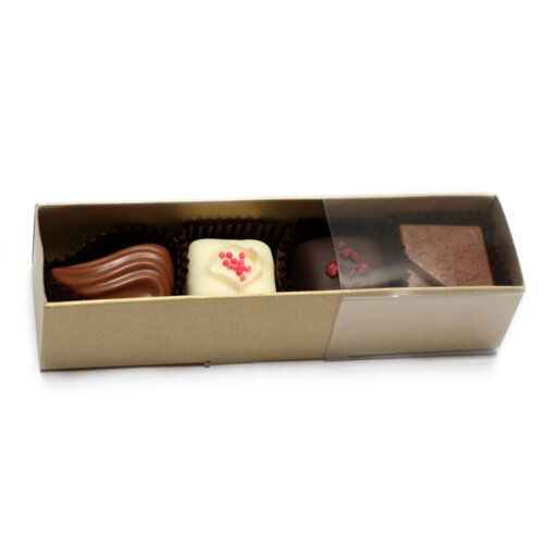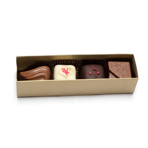 4 rôzne pralinky (℮ 42g netto) balené v elegantnej kartónovej krabičke zlatej matnej farby so zasúvacím priehľadným krytom. Veľkosť krabičky 12,5x3,5x3,0 cm (výška).