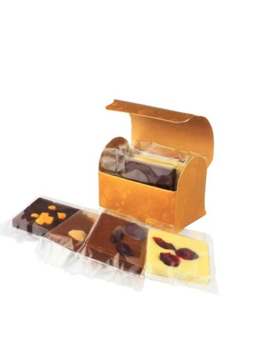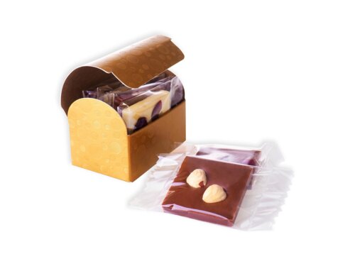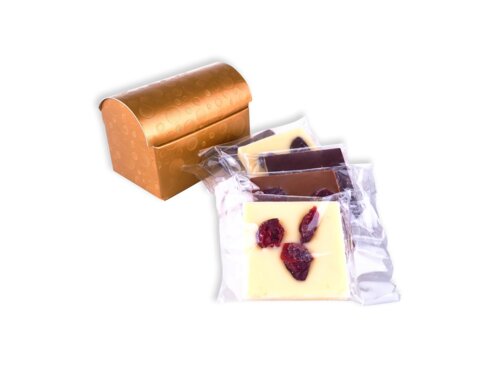 5ks tabuľkových mini čokolád (℮ 65g) v elegantnej krabičke v tvare truhličky s vekom v zlatej farbe s reliéfom. Veľkosť truhličky 7,5x4,5x5,5cm (výška). Balenie obsahuje mix čokolád (90%) horkej, mliečnej a bielej, s rôznymi posýpkami (10%) balené po kuse v celofáne a vložené do krabičky.