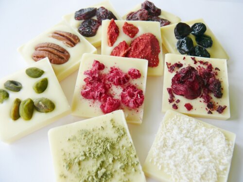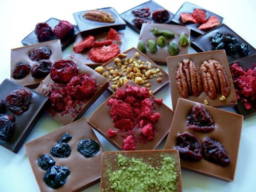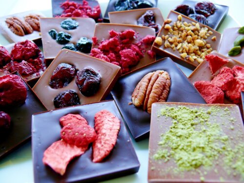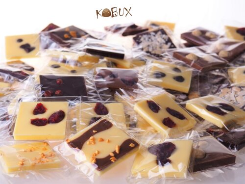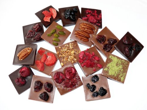 Zloženie čokolád: kakaová hmota, cukor, odtučnený kakaový prášok, kakaové maslo, sušené plnotučné mlieko, emulgátor: sójový lecitín, prírodná vanilková aróma, kandizované ovocie, sušené ovocie, orechy.